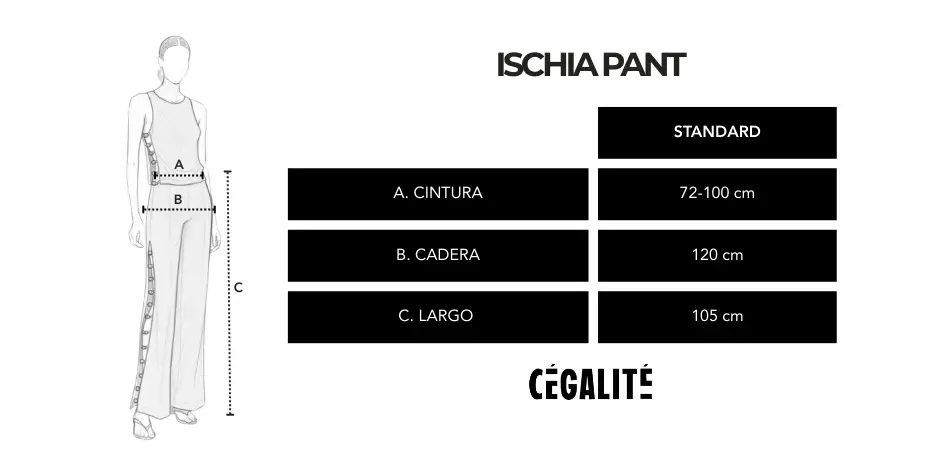 El Pantalón Ischia presenta una silueta recta y limpia, con cortes laterales y detalles de bisutería importada que aportan un giro inesperado al diseño, manteniendo un equilibrio entre lo atemporal y lo distintivo.