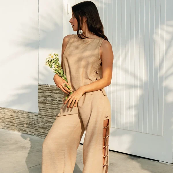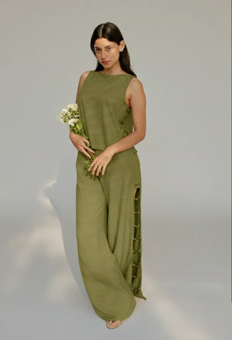 El Pantalón Ischia presenta una silueta recta y limpia, con cortes laterales y detalles de bisutería importada que aportan un giro inesperado al diseño, manteniendo un equilibrio entre lo atemporal y lo distintivo.